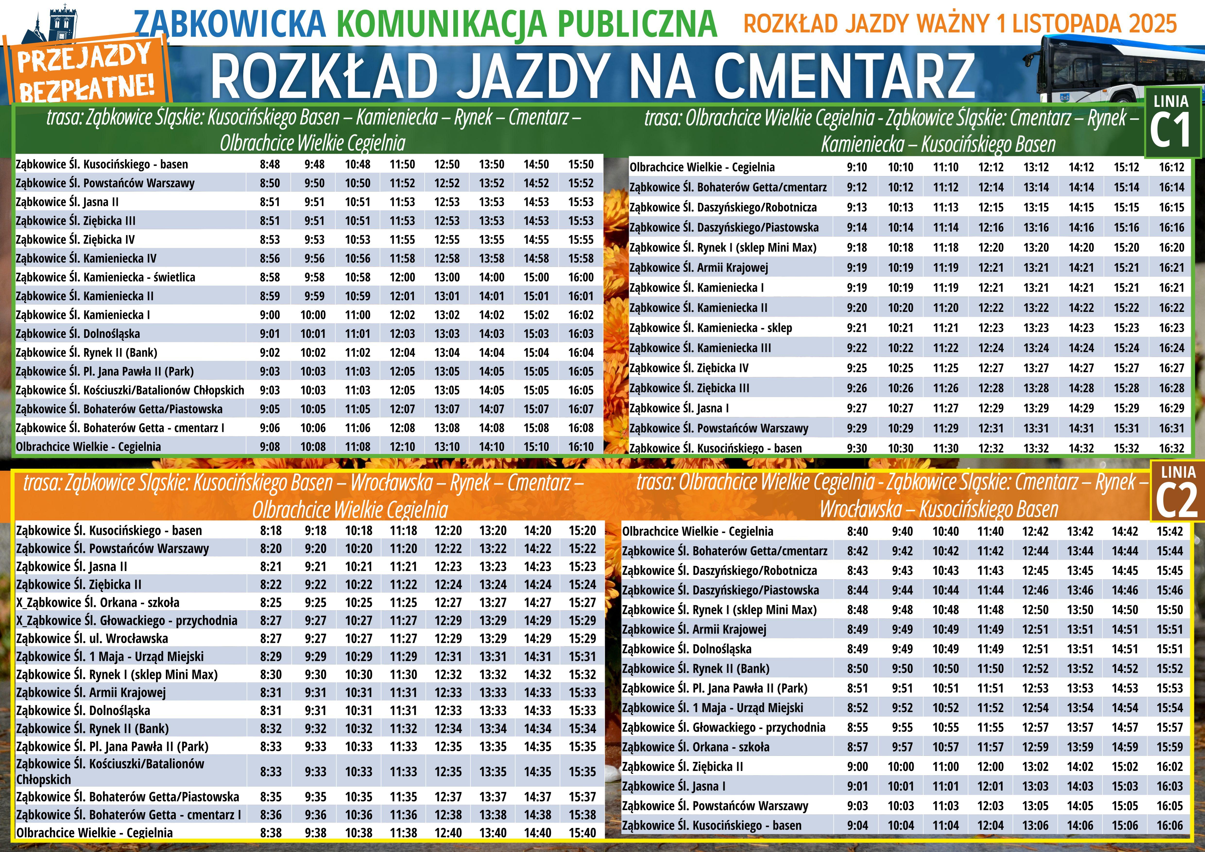 Zapraszamy do zapoznania się z rozkładem jazdy obowiązującym podczas Wszystkich Świętych. Przejazdy są bezpłatne - zachęcamy do skorzystania.