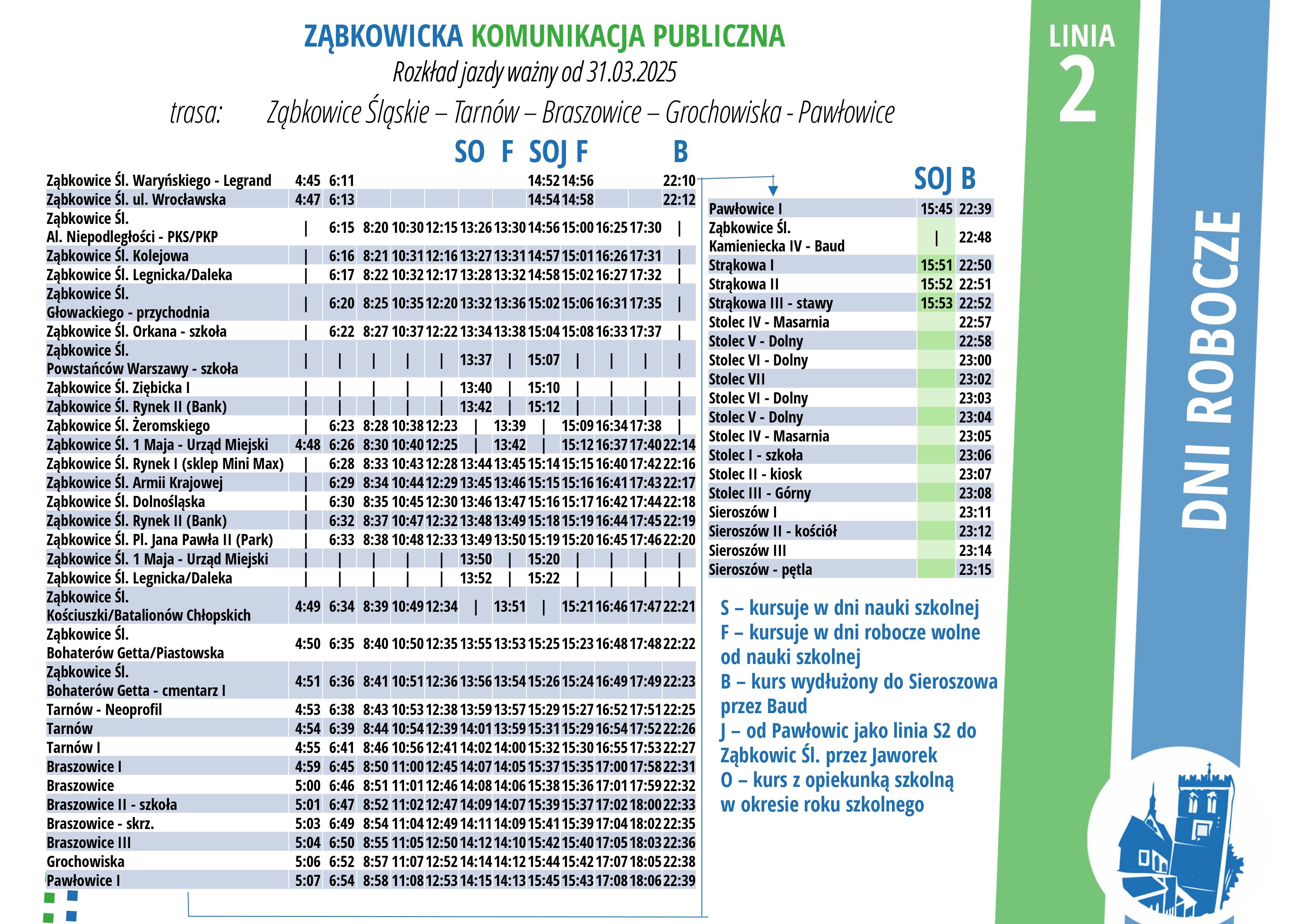 Linia szkolna S2, trasa dowozu: Brzeźnica - Grochowa - Braszowice - Tarnów - Ząbkowice Śląskie, trasa odwozu: Ząbkowice Śląskie - Olbrachcice Wielkie - Tarnów - Braszowice - Grochowa - Brzeźnica