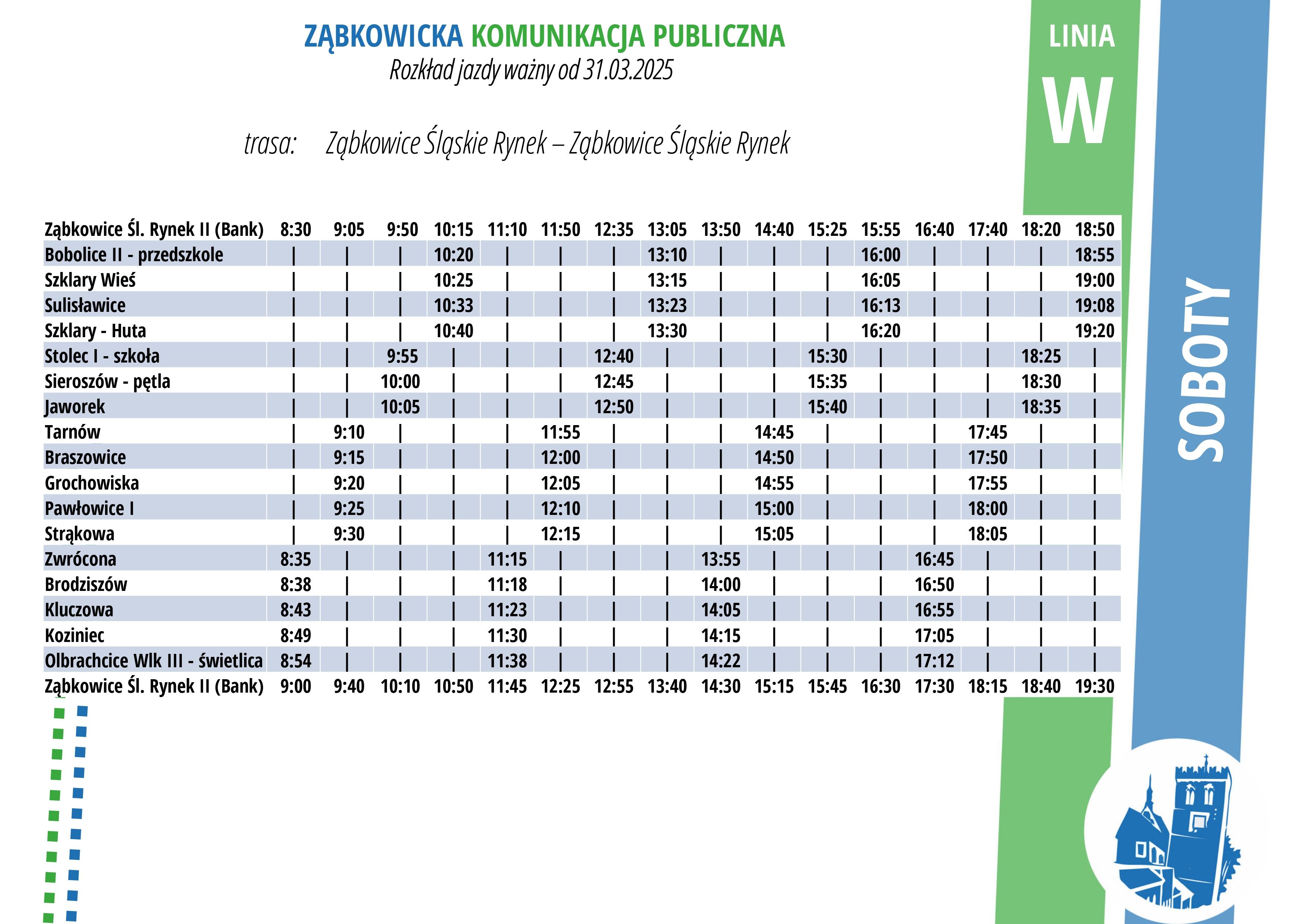 Wychodząc naprzeciw oczekiwaniom Mieszkańców zdecydowaliśmy o rozszerzeniu Ząbkowickiej Komunikacji Publicznej o przejazdy weekendowe. Po mieście kursować będą dwie linie – "A" i "B", a po sołectwach "W".