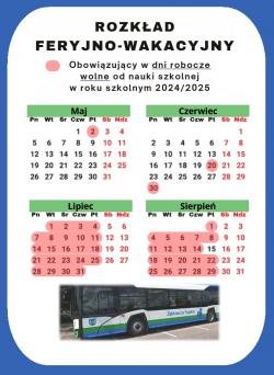 Szanowni Pasażerowie. Przypominamy, że w dniu 20.05 (piątek) obowiązuje rozkład feryjno-wakacyjny, oznaczony w rozkładzie literą F. Ponadto rozkład feryjno-wakacyjny będzie obowiązywał w dniach od 30 czerwca do 29 sierpnia 2025 r.