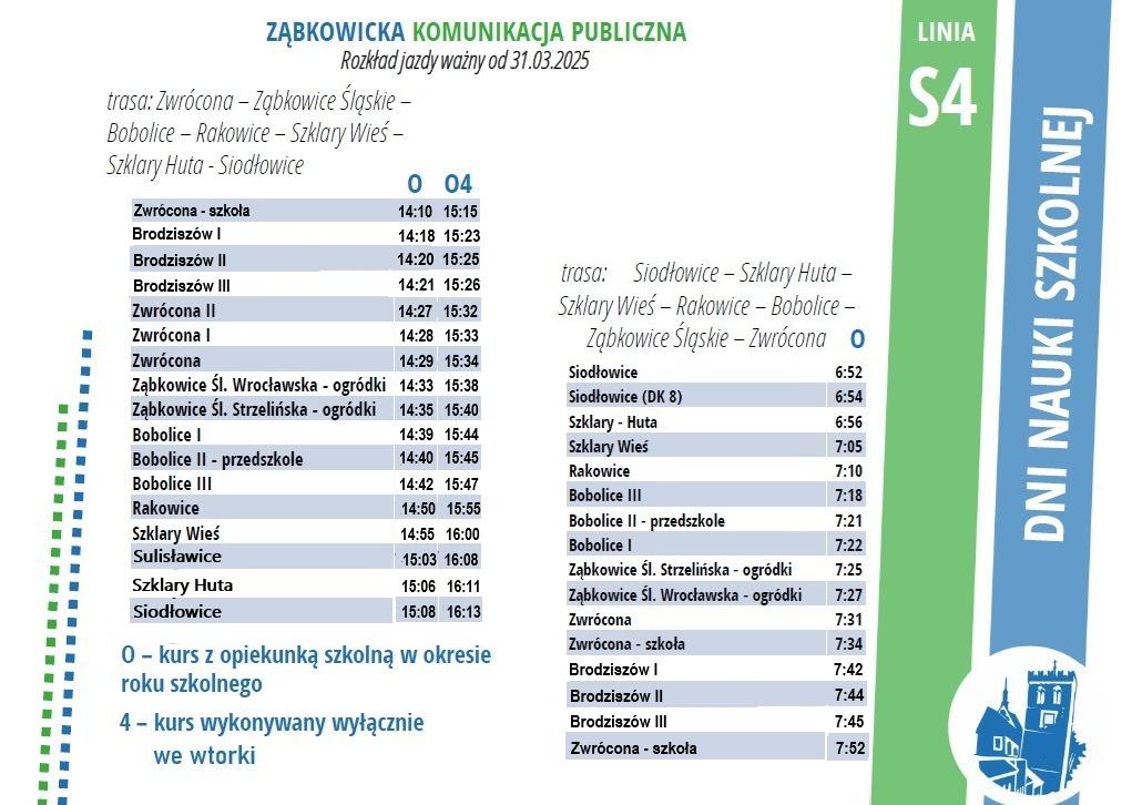 Szanowni mieszkańcy, w trakcie ferii zimowych czyli od 3 do 14 lutego 2025 r. będzie obowiązywał aktualny rozkład jazdy Ząbkowickiej Komunikacji Publicznej czyli taki jak dla dni roboczych szkolnych, z wyjątkiem linii S2 i S4, kursujących wyłącznie w dni nauki szkolnej.
