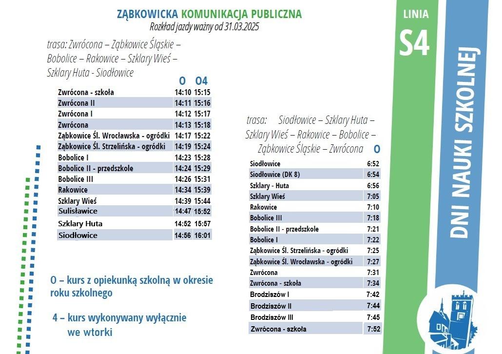 Szanowni mieszkańcy, w trakcie ferii zimowych czyli od 3 do 14 lutego 2025 r. będzie obowiązywał aktualny rozkład jazdy Ząbkowickiej Komunikacji Publicznej czyli taki jak dla dni roboczych szkolnych, z wyjątkiem linii S2 i S4, kursujących wyłącznie w dni nauki szkolnej.